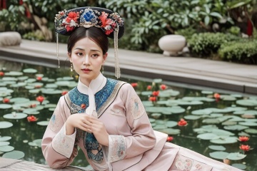 A Qing Dynasty princess, adorned in an intricately detailed traditional gown with ornate patterns and vibrant colors, gracefully sits by a lotus pond. Her makeup is subtle yet refined, highlighting her elegant features. She wears a meticulously styled headdress adorned with precious jewels and silk flowers, complementing her regal attire. The scene is bathed in soft natural light, emphasizing the intricate embroidery and accessories that signify her noble status. The composition captures her poised demeanor and the exquisite craftsmanship of her royal garments and accessories.