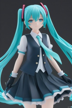 PVC手办风格,塑料小人风格,古风厚涂插画,一个女孩儿,黑色背景,hatsune miku,长发,裙子,双尾,领带,衬衫,无袖,百褶裙,独立袖,蓝眼睛,白色背景,无袖衬衫,蓝头发,长发、白色衬衫,纹身,有领衬衫,牛仔镜头,简单背景,侧胸,粉红色领带,发饰,看着观众,闭着嘴,两眼之间的头发,一只眼睛上的头发,耳机,手套,黑色裙子