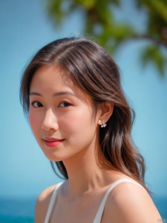 A serene young woman with luscious brown locks and warm brown eyes gazes directly at the viewer, a subtle smile playing on her closed lips. Her features are adorned with delicate jewelry, including earrings that catch the light. Framed by a stunning blue backdrop, she poses confidently, showcasing her upper body in a realistic portrait.