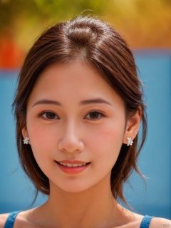 A serene young woman with luscious brown locks and warm brown eyes gazes directly at the viewer, a subtle smile playing on her closed lips. Her features are adorned with delicate jewelry, including earrings that catch the light. Framed by a stunning blue backdrop, she poses confidently, showcasing her upper body in a realistic portrait.