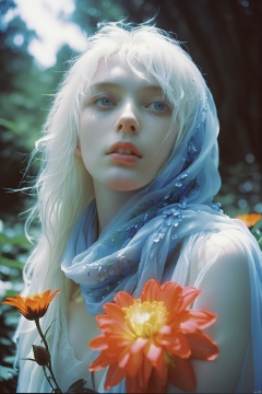 photograph, In a surreal and unexpected world, a fierce woman with long white hair and sparkling blue eyes stares out into the sky with piercing ice blue eyes. She wears a flowing red scarf that flows around her body, adding to its intensity. The scene is set in a lush forest, with flowers of every color blooming around it. The woman's face seems almost otherworldly. at Sunrise, Wide view, Cel shading, Confused, Feralcore, double exposure, Ilford HP5, vanishing point, Albumen, (key visual, cinematic grey Color grading)