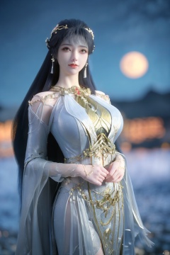 (Masterpiece:1.2), best quality,1girl, looking_at_viewer,(big breasts:1.59),Xyaoye,Large aperture, blurred background, spring scene,flowers,Xsimiaoling,full moon,Xbaiyuerong
