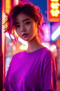 a girl in a purple top in a neon city, in the style of chinapunk, iconic album covers, soft-focus portraits, luke fildes, light amber and silver, exotic, captivating lighting