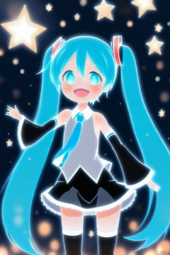 1girl, hatsune_miku, solo, twintails, skirt, long_hair, necktie, detached_sleeves, pleated_skirt, shirt, smile, very_long_hair, sleeveless_shirt, star_\(symbol\), open_mouth, sleeveless, collared_shirt, :d, hair_between_eyes, outstretched_arms, thighhighs, wide_sleeves, black_skirt, long_sleeves, looking_at_viewer, bare_shoulders, glowing, aqua_eyes, hair_ornament, standing, blue_hair, blurry, tie_clip