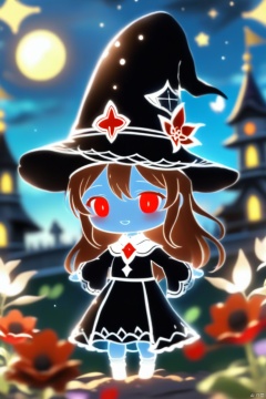 1girl, hat, solo, witch_hat, moon, dress, flower, blurry, long_hair, black_dress, depth_of_field, outdoors, red_eyes, long_sleeves, blurry_background, colored_skin, night, brown_hair, looking_at_viewer, chibi, black_headwear, sky, full_moon, blue_flower, wide_sleeves, parted_lips, hand_up, standing, witch, crescent, night_sky, tower