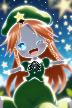 1girl, hong_meiling, one_eye_closed, long_hair, solo, braid, hat, star_\(symbol\), star_hat_ornament, twin_braids, hat_ornament, green_headwear, open_mouth, puffy_short_sleeves, chibi, blue_eyes, puffy_sleeves, green_vest, short_sleeves, smile, skirt, vest, shirt, green_skirt, looking_at_viewer, white_shirt, red_hair, wrist_cuffs, beret, frills, orange_hair, collared_shirt, ribbon, parted_bangs, outdoors, blurry, backlighting, glowing_eyes