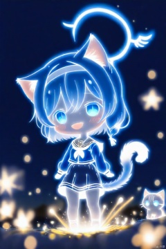 1girl, animal_ears, cat_ears, solo, cat_tail, halo, arona_\(blue_archive\), tail, skirt, chibi, fireworks, blue_eyes, cat_girl, blue_hair, sailor_collar, braid, kemonomimi_mode, looking_at_viewer, school_uniform, animal_ear_fluff, smile, open_mouth, shirt, long_sleeves, full_body, hairband, fang, serafuku, blue_halo, blush, short_hair, pleated_skirt, standing, glowing, single_braid, bow, white_sailor_collar, multicolored_hair, choker