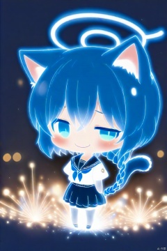 1girl, animal_ears, cat_ears, solo, cat_tail, halo, arona_\(blue_archive\), tail, skirt, chibi, fireworks, blue_eyes, cat_girl, blue_hair, sailor_collar, braid, kemonomimi_mode, looking_at_viewer, school_uniform, animal_ear_fluff, smile, open_mouth, shirt, long_sleeves, full_body, hairband, fang, serafuku, blue_halo, blush, short_hair, pleated_skirt, standing, glowing, single_braid, bow, white_sailor_collar, multicolored_hair, choker
