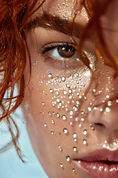 An extreme close-up shot of water droplets falling on a woman's face, brown hair,red head,realistic detail, sharp focus, shiny eyes, shot with an 85mm Leica lens, f4.6, ultra realistic concept photography, award winning portrait inspired by Ákos Major.