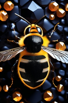 Honeybee made out of black diamonds, honeycomb shimmering glistening black diamonds that twinkle, honey falling to the grounds, gold string ties it all together, p1nkblackd1am0nds, enhanced textures, creative, beautiful, vibrant, masterpiece, 8k, ultra HD, ultra-detailed, amazing quality, amazing artist, sharp edges, detailed textures, full view, atmospheric lighting, amazing visuals