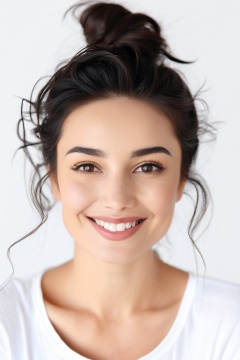 (best quality, 4k, 8k, highres, masterpiece), ultra-detailed, a woman wearing a white t - shirt with her hair in a messy bun and a smile on her face, woman, looking at viewer, smile, open mouth, simple background, shirt, black hair, white background, brown eyes, white shirt, teeth, portrait, realistic, photorealistic