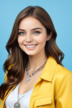 (best quality, 4k, 8k, highres, masterpiece), ultra-detailed, woman, long hair, smile, simple background, brown hair, jewelry, jacket, upper body, necklace, mole, looking to the side, blue background, realistic, yellow jacket
