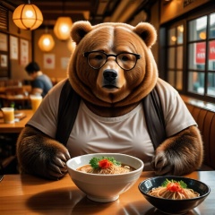 Create an extremely realistic photo of a fat bear wearing glasses and a short-sleeved shirt, sitting at a table and eating ramen in a cozy, dimly lit diner. The image features ultra-sharp focus, realistic textures and fur, and rich colors. The composition is high definition, HDR, with extreme and intricate details, sharp focus, and enhanced all aspects for a masterpiece quality photo. The bear is in a satisfied pose, with detailed facial features and expressive eyes, set against a detailed, warmly lit diner background with steam rising from the ramen bowl.