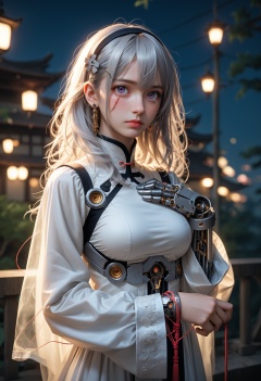 1girl,solo,looking at viewer,medium hair,bangs,hairband,purple eyes,hair ornament,hair between eyes,white hair,fluffy hair,large_breasts,blush shy,shiny_skin,very detailed clothes,very realistic textures,very detailed textures,longeyelashes,brown eye shadow,night,dim light,cyberpunk,mechanical arm,sci-fi style clothes,hair_tucking,metal material,realistic metallic texture,hands,raise your hand,Injuries,scratches,gears,links,chains,wires,sparks,electric sparks,crying,tears,1girl,large_breasts,Gray hair,air bangs,very long hair,thick hair,fluffy hair,Chinese clothing,very long dresses,hair accessories,hairpins,loose sleeves,long sleeves,bracelets,earrings,Hanfu,fine costumes,fine textures,girl standing beside the peach tree in a daze,flapping her hair,light yarn,translucent,, cinematic film still,score_9,score_8_up,score_7_up,dramatic lighting,(realistic:1.3),highly detailed,high budget,bokeh,cinemascope,moody,epic,gorgeous,film grain,grainy,masterpiece,best quality,perfect anatomy,very aesthetic,official art,8k,
