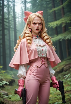 score_9, score_8_up, score_7_up, score_6_up, source_anime, 1girl, solo, blonde hair, long hair, drill hair, hair bow, earrings, pink capelet, ascot, frilled shirt, pink pants, pink gloves, boots <lora:GatlingGun_pdxl_Incrs_v1:1> gatling gun, holding gatling gun, annoyed, open mouth, forest