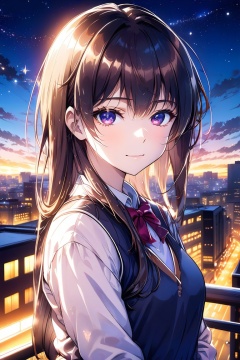 A very beautiful girl, masterpiece quality, light particles, city in background, looking at viewer, upper body,Anime Style.