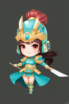 Q版灵动武将是个身材纤细的女性,头戴一个小巧的金色头盔,上面装饰着俏皮的流苏。她的脸庞大而圆润,眼睛闪烁着灵动的光芒,表情甜美而充满活力。身穿轻盈的铠甲,青色为主色调,铠甲边缘装饰有简化的花纹。右手持一把小巧的弯刀,左手拿着一个小巧的法杖。她的靴子设计简洁,但脚步轻盈,显得灵动又可爱