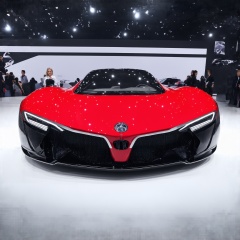 ((Ultra-realistic)) photo of Hongqi S9 hypercar,Red and Black color,shiny spinning wheels,glossy Black alloy rims with silver edge,bright turned on head lights,(backdrop of Detailed Realistic car showroom,interior,lights,racing girl,people,spot lights,cluttered maximalism),depth of perspective,vehicle focus,sports car,(wide shot)