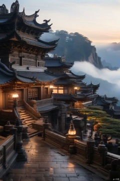 Majestic ancient temple complex majestically rises from the misty mountainside, its intricately carved wooden doors and ornate stone carvings glistening in soft morning light. Weathered terra cotta rooftops blend seamlessly into the surrounding landscape as wispy clouds drift lazily by. The air is thick with the scent of incense wafting from lantern-lit alcoves.
