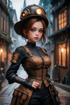 (ethereal dark fairy tale by Tim Sale), young anime girl steampunk, fight stance in a steampunk city, steampunk outfit, (dark + gothic, + foreboding background:1.4), more detail XL,Cartoon,Enhance,pixar style