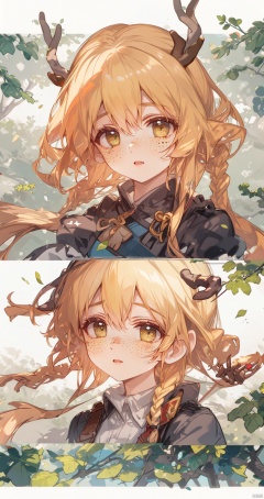 Vintage portrait, photography style, soft focus, pure face,Deer, girl, antlers, vine with leaves, Blonde hair, European and American advanced face, freckles, Detailed light and shadow, Wind, (Strong Sunshine),Two plaits, The forest,Front light source,