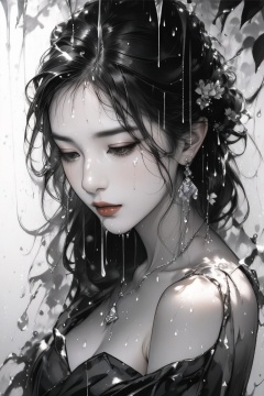 Very beautiful girl, elegant woman, raining droplets, ((monochrome: 1.2)), white background, ((masterpiece: 2)), medium shot, bare shoulders, looking at viewer, ((stunning image: 1.5)), Ink art style
