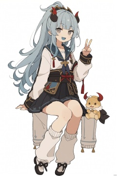 1girl, solo, long hair, looking at viewer, smile, open mouth, bangs, skirt, simple background, long sleeves, white background, holding, sitting, blue hair, full body, ponytail, :d, pleated skirt, horns, shoes, socks, fang, black skirt, grey eyes, v, white socks, loose socks, leg warmers, blue tongue,Iwashi