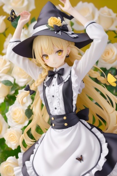 masterpiece,loli,1girl,hat,kirisame marisa,blonde hair,solo,yellow eyes,bug,witch hat,butterfly,long hair,braid,bow,flower,apron,black headwear,single braid,long sleeves,earrings,hair ornament,jewelry,white bow,hair flower,shirt,white shirt,closed mouth,hair between eyes,black bow,waist apron,white apron,hat bow,black skirt,white flower,blush,bowtie,skirt,black bowtie,looking at viewer,hair bow,rose,black vest,vest,frills,signature,buttons,hand on headwear,upper body,frilled apron,white rose,arms up,cowboy shot,yellow butterfly,arm up,hands up,artist name,side braid,ribbon