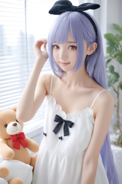 masterpiece,best quality,Realism,depth of field,lens_flare,loli,1girl, long hair, solo, stuffed animal, stuffed toy, hair bow, bow, black bow, teddy bear, looking at viewer, dress, white dress, indoors, realistic, hairband, plant, smile, window blinds, grey eyes, blunt bangs, blue hair, breasts, collarbone, closed mouth, very long hair, bare shoulders, grey hair, lips, window, sleeveless dress, small breasts, black hairband, hand on own head, potted plant, spaghetti strap, brown eyes, sleeveless, cleavage, blurry, day, upper body