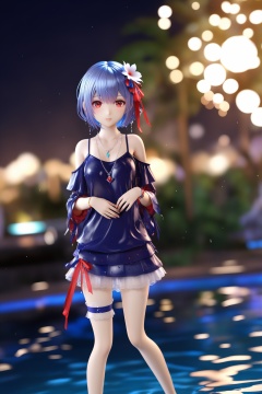 (masterpiece),(best quality),illustration,ultra detailed,hdr,Depth of field,(colorful),mmd,night,1girl,solo,red eyes,looking at viewer,hair ornament,short hair,upper body,wet hair, hair ribbon, hair flower, leg_garter, necklace, bracelet, cold shoulder,miniskirt,royal