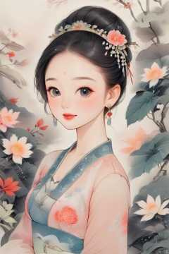 earrings,jewelry,solo,flower,1girl,looking at viewer,makeup,upperbody,shorthair,whitebackground,closedmouth,chineseclothes,floralbackground,dress,eyelashes,smile,simplebackground,whiteflower,eyeshadow,lipstick,partedbangs,blush,flowerearrings,portrait,chinadress,straight-on,leaf,floral print, Chinese hand-painted figure painting, traditional Chinese ink painting