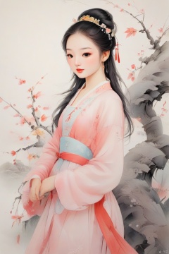 Girl in ancient Chinese costume, wearing pink traditional dress, holding plum branches, delicate face, side view, white background, pastel painting, minimalism, full-body shooting, fantasy art, ink painting, fine lines, color gradient, ultra-high detail on white background, simple and elegant atmosphere, high resolution , Chinese hand-painted figure painting, traditional Chinese ink painting