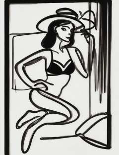 DonM0n3L1n3 one line drawing, female middle-aged, solid, inuit, hazel eyes, upturned nose, strong jaw, cheekbones, dark chestnut tousled waves hair, curiosity wearing cheeky, bralette bikini top, flip-flops, fascinator hat, amulet ,,, lying on back with legs raised, lying on the back with legs raised, showcasing a playful and captivating pose, neon lighting, vibrant, colorful lights adding a modern and edgy touch to romantic scenes, a cozy living room with a crackling fireplace and comfortable seating, bedroom, broom and dustpan,desk,sofa,picture frames,storage bins, obsidian stone,linoleum flooring,inlay weave tapestry, gas lanterns,sunlight through windows, fiber optic lighting <lora:DonM0n3L1n3:0.8>