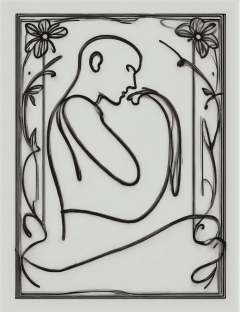DonM0n3L1n3 one line drawing, male late twenties well-defined, south asian, steel gray eyes, downturned ears,   receding jaw,  low forehead, square face shape,  , ash blonde crew cut hair, contempt wearing  G-Strings,   sandals,  , kissing pose, leaning in for a kiss with a passionate expression, conveying intimacy and desire, low-key lighting, dramatic shadows and subtle highlights, adding mystery and sensuality, a peaceful garden, with blooming flowers and butterflies fluttering around, bedroom, clocks,curtains, porcelain tiles,inlay weave tapestry, fluorescent tubes, laser lights <lora:DonM0n3L1n3:0.8>