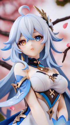 (score_9,score_8_up,score_7_up),source_anime,furina (genshin impact),1girl,solo,blue eyes,blue hair,long hair,looking at viewer,white dress,ahoge,multicolored hair,blue nails,upper body,bare shoulders,dress,parted lips,flower,holding,white hair,heterochromia,detached sleeves,mismatched pupils,light blue hair,nail polish,petals,blush,hair between eyes,streaked hair,breasts,strapless dress,branch,strapless,