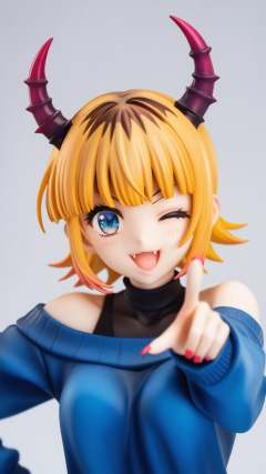 (score_9,score_8_up,score_7_up),source_anime,1girl,demon_horns,solo,upper_body,fang,blonde_hair,multicolored_hair,short_hair,roots_\(hair\),highres,:3,black_shirt,blue_eyes,blue_sweater,commentary,covered_collarbone,grey_background,long_sleeves,looking_at_viewer,memcho,nail_polish,off_shoulder,one_eye_closed,open_mouth,pink_nails,pointing_at_self,simple_background,sleeveless_shirt,,<lora:oshi_no_ko:1>,