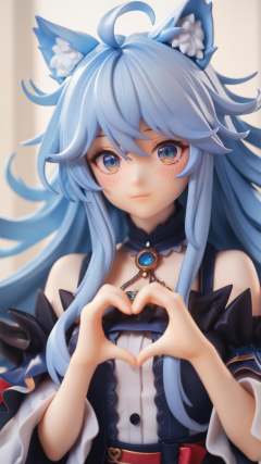 (score_9,score_8_up,score_7_up),source_anime,wolf ears,light blue hair,long hair,slant eyes,messy hair,idol,stage,hand heart,blush,portrait,