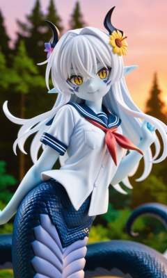 score_9,score_8_up,score_7_up,source_anime,1girl, Alice, face marking, breast marking, thigh marking, arm marking, hair flower, hair ornament, colored skin, blue skin/grey skin, horns, pointy ears, yellow eyes, slit pupils, bangs, hair between eyes, sidelocks, white hair, sunset, smile, outdoors, forest, anime screencap, lamia, pointy ears, yamaku school uniform