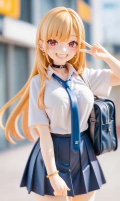 score_9,score_8_up,score_7_up,source_anime,1girl,sensitive,kitagawa marin,solo,long hair,breasts,looking at viewer,blush,smile,shirt,skirt,blonde hair,red eyes,jewelry,school uniform,white shirt,earrings,pleated skirt,necktie,collared shirt,choker,bag,grin,bracelet,blue skirt,v,black choker,blurry background,piercing,ear piercing,blue necktie,school bag,