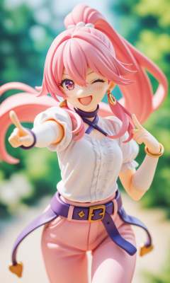 score_9,score_8_up,score_7_up,source_anime,blurry background,pov,wink,pointing,cowboy shot,open smile,blush,pink hair,high ponytail,pink eyes,long hair,earring,hair between eyes,white shirt,belt,pink pants,puffy pants,elbow gloves,purple belt,bracelet,green neckercheif,
