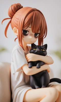 score_9,score_8_up,score_7_up,source_anime,young girl,skinny,looking at viewer,sitting,bags under eyes,tired,hair bun,hug cat,