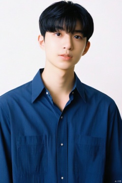这是一张年轻男子的半身肖像照,他穿着一件深蓝色的衬衫, liangyi