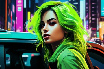 cover painting banner a girl with green neon hair, green cloth, car, city, street, contact eyes, best quality