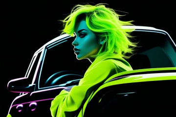 cover painting banner a girl with green neon hair, green cloth, car, black background, contact eyes, best quality