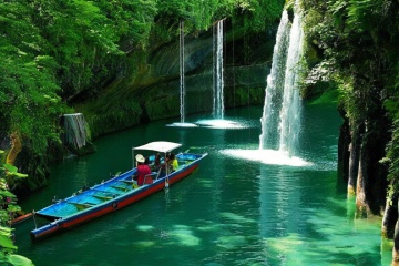 Island landscape, boat, trees, vines, mountains, waterfalls, photography, vivid color