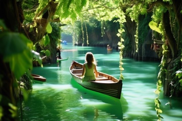 A serene island landscape: a young girl sitting on a wooden boat, surrounded by lush greenery of vines and towering trees.