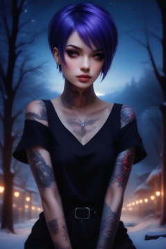 A photorealistic oil illustration of a beautiful goth female, sad eyes, lonely, sharp bobcut, purple hair, arm tatoo, epic composition, realistic, evening, bokeh lights, winter background, AAp41nt3dladies