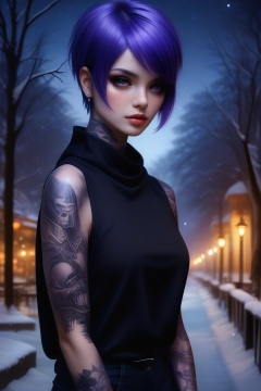 A photorealistic oil illustration of a beautiful goth female, sad eyes, lonely, sharp bobcut, purple hair, arm tatoo, epic composition, realistic, evening, bokeh lights, winter background, AAp41nt3dladies