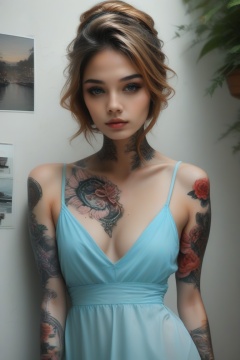 photorealism, photo-model view, 1girl, seductive look, beautiful face, lustful, neck tattoo, wearing summer dress, ultra detailed background concept art, realistic, AAp41nt3dladies