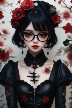 photorealism, photo-model view, Catholicpunk cute goth girl in a fusion of Japanese-inspired Gothic punk fashion, glasses, goth, black gloves, tight corset, incorporating traditional Japanese motifs and punk-inspired details,Emphasize the unique synthesis of styles, flowers ,heavy makeup, earrings, Lolita Fashion Clothes, kawaii, hearts ,emo, kawaiitech, dollskill, chibi, Eyes AAp41nt3dladies